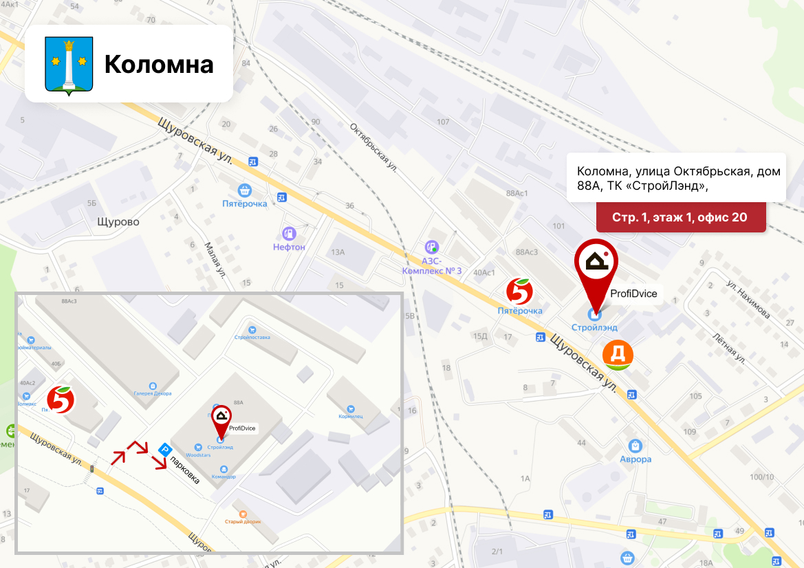 - Коломна, микрорайон Щурово, улица Октябрьская, дом 88А, ТК 'СтройЛэнд', строение 1, этаж 1, офис 20